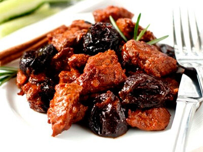 Говядина режем ломтиками, лук кольцами, а зелень измельчается. Перемешиваем всё в кастрюле вместе со сливочным и растительным маслом. Чернослив, говядина, лук, зелень выкладываем слоями. Мясо кладем последним слоем и покрываем натертым сливочным маслом. Добавляем соль, специи, лавровый лист, воду. Потом всё накрываем крышкой и отправляем тушиться на 1,5 часа. Пальчики оближете. И уж точно не потолстеете.