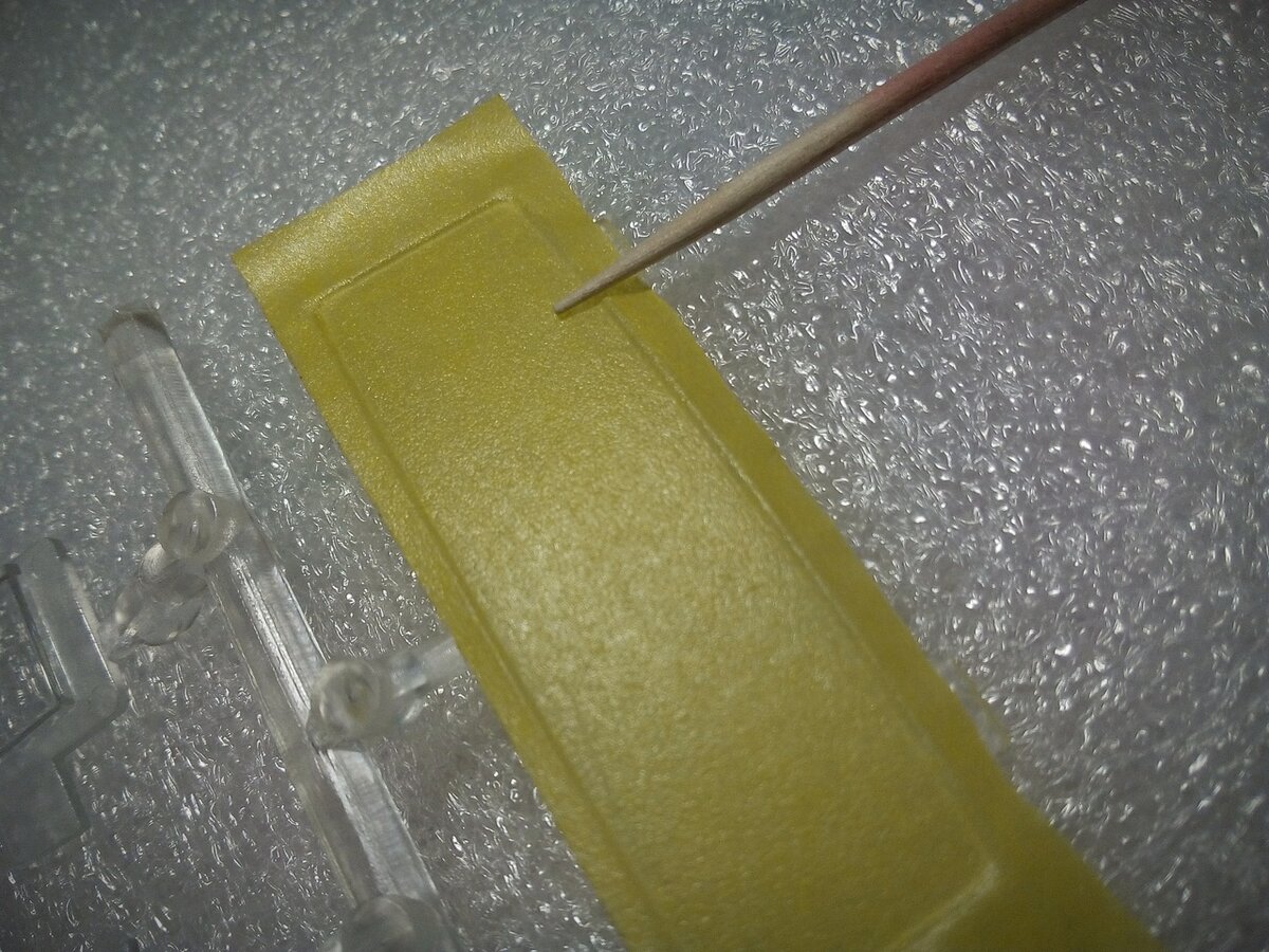 Далее нам понадобиться зубочистка, с помощью которой необходимо будет путем небольшого придавливания обвести контур стекла.