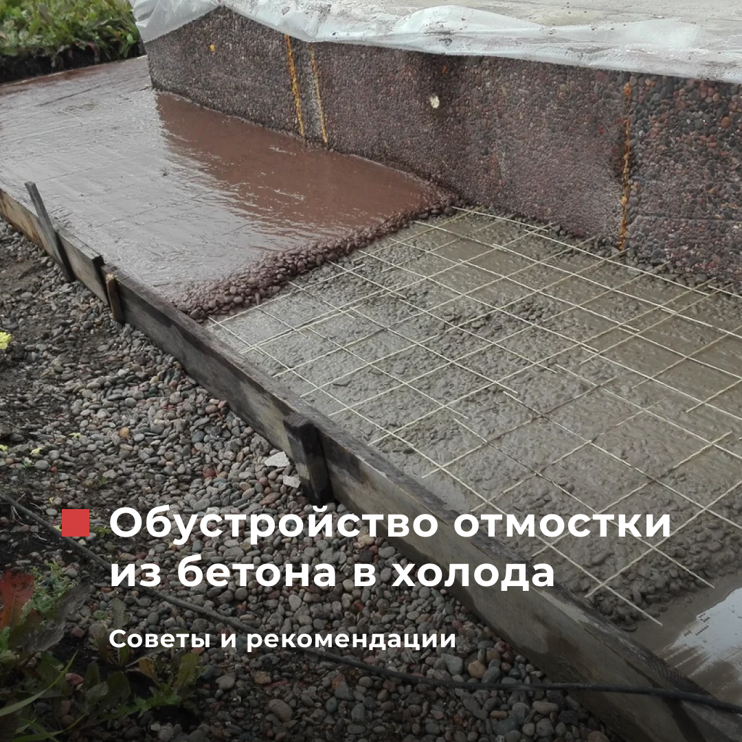 Отмостки, как и дорожки – это большая открытая поверхность, но малая толщина. Такие конструкции остывают практически мгновенно, а значит, даже при небольшом минусе отмостка быстро промерзнет. Чтобы этого не случилось: 1. ПРОГРЕЙТЕ ОСНОВАНИЕ Даже если температура плюсовая, мерзлый грунт быстро охладит свежезалитый бетон. Перед укладкой прогрейте основание феном, тепловой пушкой или просто горячей водой. Если используете воду, убедитесь, что она вся ушла в грунт. Основание обязательно должно быть плюсовой температуры. ! Допускать замораживания бетона нельзя. Оттаявший материал не наберет заявленную прочность, конструкция получится хрупкой и менее защищенной от агрессивных сред. 2. ИСПОЛЬЗУЙТЕ ПМД Если в первые дни после заливки возможно падение температуры ниже нуля, обязательно используйте бетон с противоморозной добавкой. 3. ПОДДЕРЖИВАЙТЕ ПЛЮС Свежезалитую отмостку важно прогревать, даже если минус совсем небольшой. Поддерживать температуру можно с помощью тепловых пушек, ме