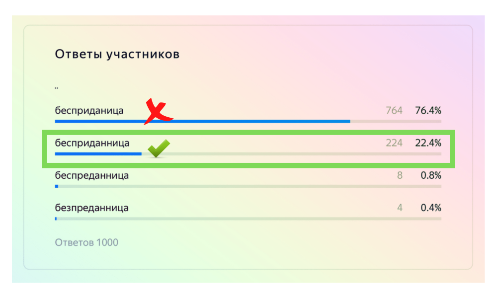 Лишь 22,4% респондентов смогли написать слово «бесприданница» без ошибок. В опросе на момент подготовки теста приняли участие 1000 человек.
