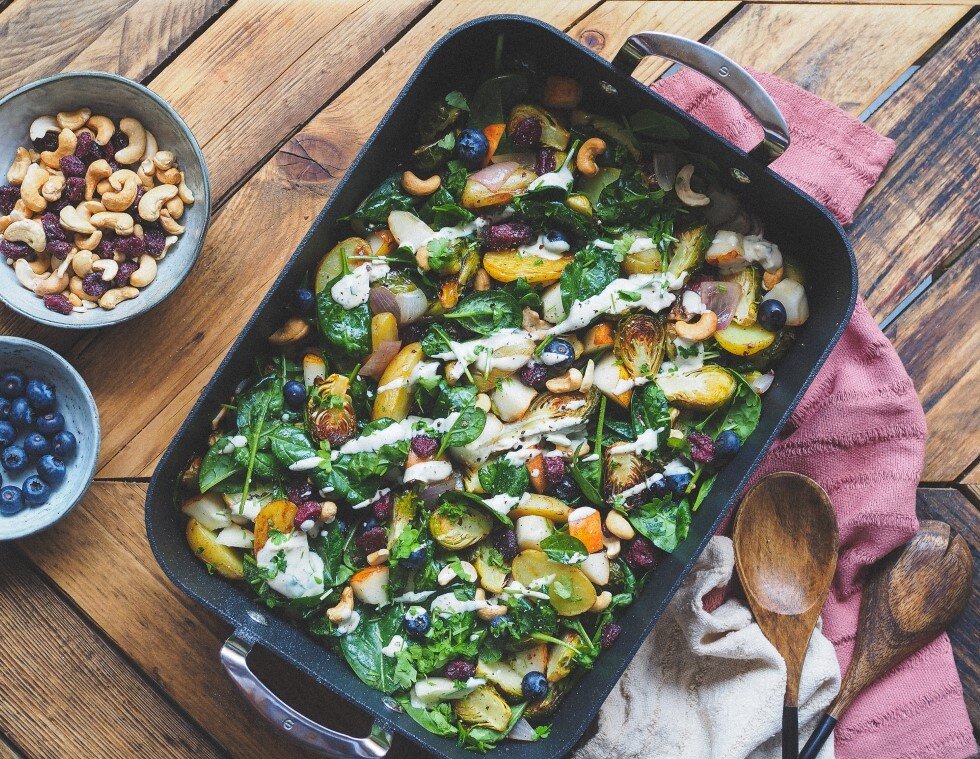 Хоть в названии осень, но я думаю, что это может быть и зимний рецепт , или вы можете сделать это, когда захотите. Однако ингредиенты больше соответствуют более холодному времени года. Мне вообще нравится сочетание овощей и фруктов в салатах, и когда холоднее, мне очень нравится, когда салаты с жареными овощами. В то же время мне больше нравятся кремовые начинки. С другой стороны, летом я предпочитаю свежие ингредиенты с добавлением свежей заправки, например, чтобы насладиться прекрасным вкусом летних помидоров. Для кого-то посыпка этого салата может быть более острой из-за чеснока и дижонской горчицы, поэтому я рекомендую вначале делать меньше, а затем, возможно, добавлять по вкусу. Какие ингредиенты понадобятся: 2 большие порции, 15 минут приготовления + 30 минут запекания овощей Для салата: 120 г свежего молодого шпината 1 сладкая спелая груша большая горсть черники большая горсть орехов кешью большая горсть сушеной клюквы горсть свежей петрушки соль и свежемолотый перец Для жареных