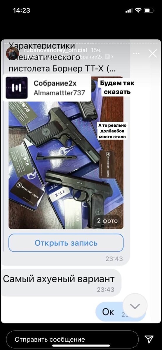 Сегодня вечером в беседах Северо-западного государственного медицинского университета имени Мечникова начали говорить про некого Андрея Рубанова, студента первого курса лечебного факультета. В своём инстаграме Андрей начал выкладывать пугающие для остальных студентов истории, которые наводят на мысли про нового "питерского" стрелка Как говорят сами студенты СЗГМУ, парня обидели девочки из потоковой группы и его это так сильно задело, что он начал им угрожать знакомыми из силовых структур и говорить что за него "весь Питер встанет". Самому же Андрею 21 год. В этом году он был отчислен с второго курса Военно-медицинской академии имени Кирова и перепоступил в СЗГМУ, где над ним начали неудачно подшучивать однокурсницы. Парень также пробовал себя в репе и как показывают отзывы студентов ВМедА неудачно. Все слова и неудачи в жизни Рубанова привели к угрозам повторить Казань или Керчь, что страшно. Как говорят учащиеся СЗГМУ, Андрею нужно сходить к специалисту и проработать свои проблемы