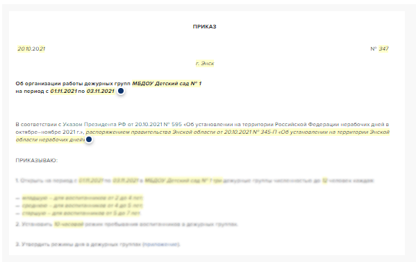 Чтобы проинформировать сотрудников о нерабочих днях с 28 октября по 7 ноября 2021 года, а также определить количество сотрудников, которые будут продолжать работать, издайте приказ о нерабочих днях. Ознакомьте сотрудников с приказом любым удобным способом. Приказ о работе дежурных групп в детском саду в связи с нерабочими днями с 28 октября по 7 ноября 2021 года Как оплатить нерабочие дни За нерабочие дни с 28 октября по 7 ноября 2021 года сотрудникам полностью сохраните заработную плату. Это значит, что сотрудникам на окладе выплатите зарплату в полном размере. Норму рабочего времени за ноябрь на эти дни не уменьшайте. Но нерабочие дни с 28 октября по 3 ноября и с 5 по 7 ноября не относят к выходным или праздничным дням. Поэтому если срок выплаты зарплаты попадает на период с 28 октябр