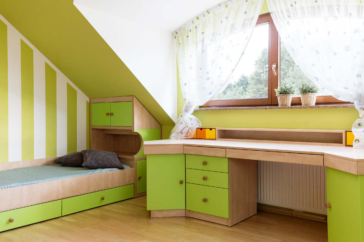 Скошенные скаты крыши выполняют одновременно роль потолка и стен. Вписать в такое помещение мебель — непростая задача, поскольку предметы интерьера стандартных форм и размеров попросту не рассчитаны на установку в ниши. Пространство со столь сложной геометрией требует особого подхода: предпочтение при этом отдают встроенной мебели, поскольку она выполняется на заказ, в соответствии с размерами и особенностями планировки.