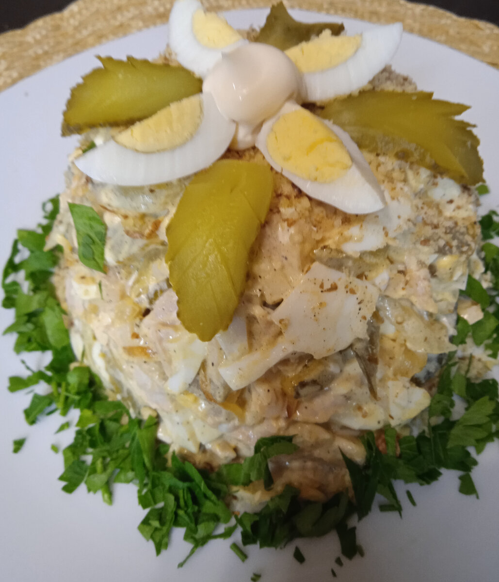 - Все ингредиенты сложить в миску, добавить измельчённый грецкий орех, соль , перец по вкусу, майонез. Аккуратно перемешать, охладить в холодильнике. Перед подачей украсить ломтиками яиц, огурца, посыпать тёртым орехом и рубленой зеленью.
