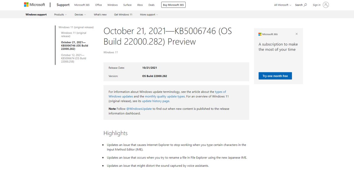 Майкрософт выпустила первое необязательное (тестовое) накопительное обновление 22000.282 (номер KB5006746) для стабильной версии первого функционального обновления Windows 11 (официальное название "Windows 11", версия 21H2). Данное накопительное обновление не содержит новых функций, и содержит исправления ошибок, связанных с производительностью процессоров AMD Ryzen, отображением меню "Пуск", работы окна Поиск на подключённом дополнительном мониторе, применения слайдшоу для экрана блокировки/экрана входа в систему, работы игровой панели Xbox ("Xbox Game Bar"), запуска окон приложений с использованием нажатой клавиатурной клавиши "Shift" и нажатия левой кнопки мыши по значку приложения на Панели задач, работой Проводника, "PowerShell", Экранного диктора.