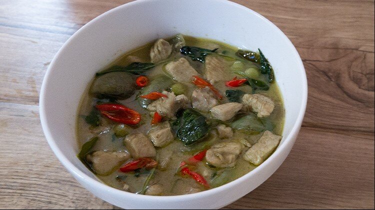 Время готовки: 25мин. Порции: 2 แกงเขียวหวานไก่ | Одно из популярных блюд в тайской кухне — это зеленое карри с курицей. Блюдо подается с варенным длиннозерным рисом. Остроту можно регулировать несколькими способами: