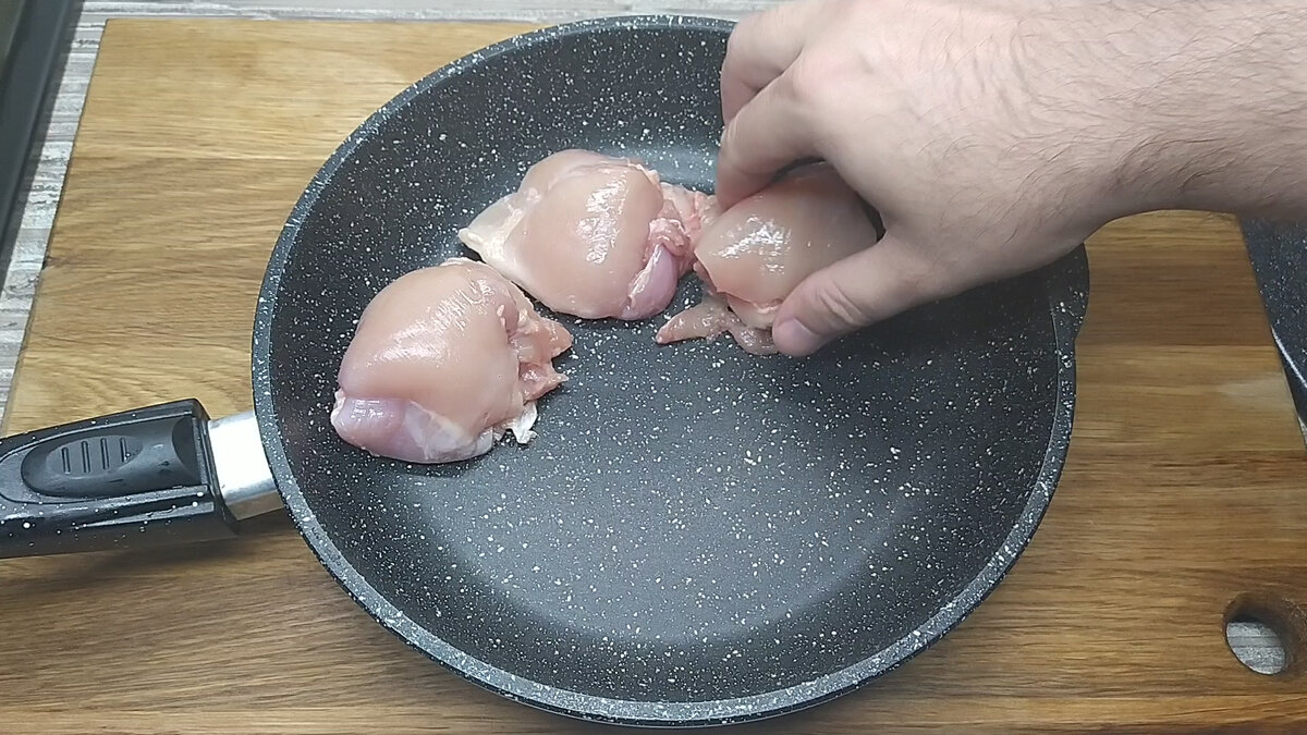 Выкладываем на сковороду 600 гр куриных бёдер.