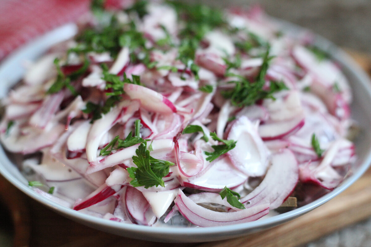 Первым делом займемся луком. Нужно, чтобы он хорошенько промариновался. Чистим лук и режем его четвертинками колечек или перышками – как вам больше нравится. Не обязательно использовать именно красный лук – подойдет любой салатный или обычный репчатый. Просто с ярким луком закуска смотрится более нарядно.