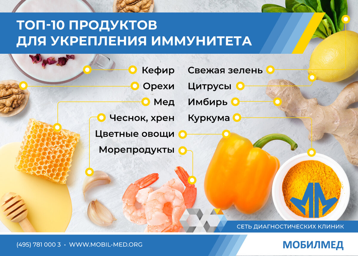 Все знают - сбалансированное питание является важнейшим фактором здорового образа жизни. Сегодня мы расскажем какие продукты стоит включить в свой рацион для укрепления иммунитета и почему. Кефир Кисломолочная продукция положительно влияет на органы ЖКТ. А как мы знаем микрофлора и иммунитет связаны самым тесным образом - почти 80% всех иммунных клеток несут свой дозор именно здесь. Поэтому пробиотики очень важны для поддержания нормальной микрофлоры. Орехи Миндаль богат витамином Е, который является антиоксидантом. В кедровых много цинка. Фундук снижает риск воспалительных процессов. Мед Пчелиный мед содержит магний, кальций, железо, витамины С и В, которые в совокупности улучшают пищеварение и оказывают противовоспалительное действие. Чеснок, хрен Чеснок и хрен богаты фитонцидами - активными веществами, убивающими бактерии или подавляющими их рост. Цветные овощи Цвет овощам придают наличие тех или иных элементов, поэтому сделав салат из разноцветных овощей вы можете быть уверены, что