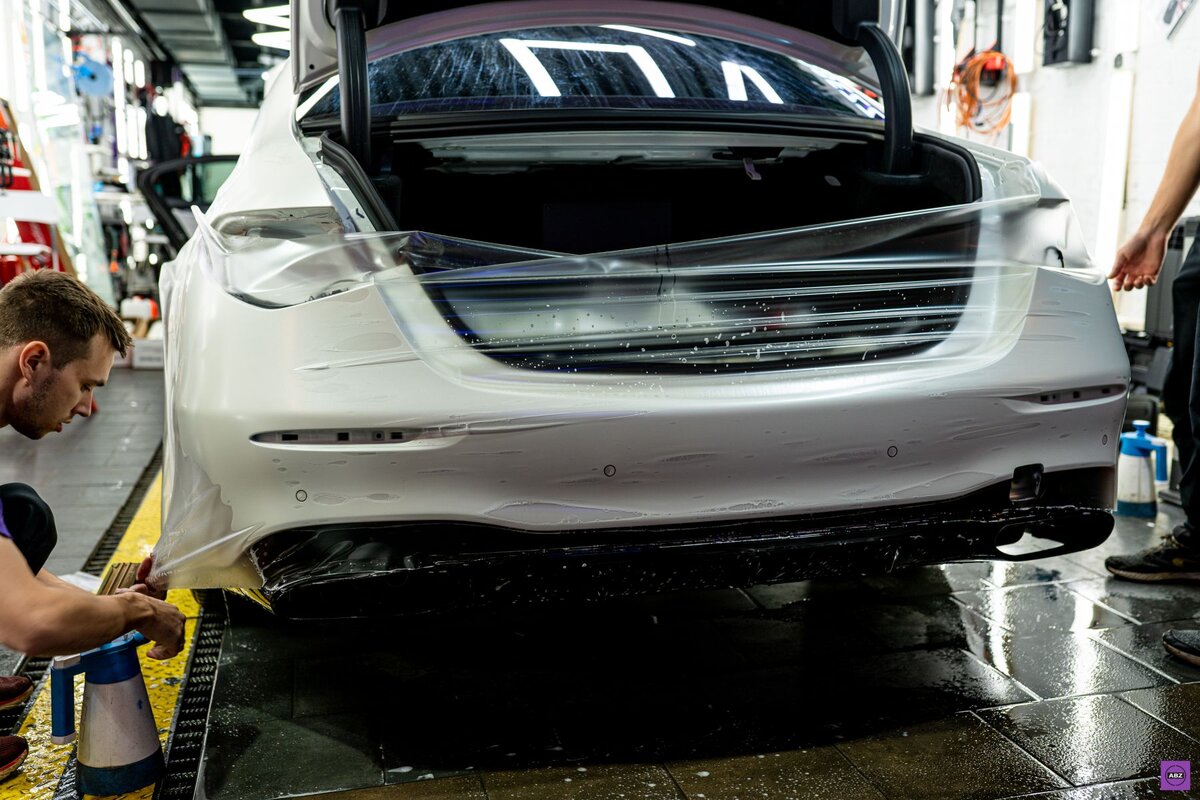 Как будет выглядеть белый Mercedes-Benz S Class если кузов полностью затянуть матовой антигравийной полиуретановой пленкой и убрать весь хром? Для нетерпеливых внизу видео от Андрея, в котором вы можете увидеть, как работают наши мастера, оценить качество нашей работы и измененный внешний вид этого “немца”. А здесь мы немного поговорим о пленках, о том, как правильно подобрать материал для белой машины, про защиту салона, оптики и стайлинге. Защита белого кузова, как правильно выбрать пленку Белый кузов требует особенного ухода. На нем очень хорошо видны любые пятна, особенно те, которые остаются после периода цветения деревьев, а также от помета птиц. Никто не хочет, чтобы его белоснежный автомобиль через год-два превратился в желтый с непонятными разводами. Большинство из вас знает, а мы лишний раз напомним, что полировка лакокрасочного покрытия — это не панацея и может проводиться ограниченное количество раз. Для белой, как и для любой другой машины, спасением станет защита антиграв
