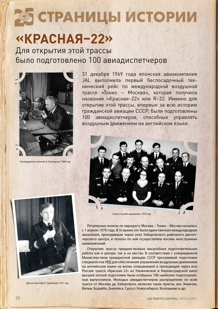 В этом очерке, опубликованном в рубрике журнала Air Traffic Control, посвященной грядущему 25-летию ФГУП «Госкорпорация по ОрВД», рассказывается о том, как создавалась воздушная трасса «Токио – Москва». https://gkovd.ru/press-centre/publications/2021/krasnaya-22/