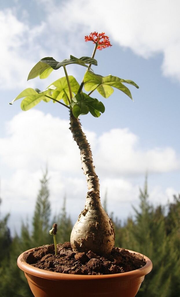Ятрофа относится к семейству молочайных(eupborbiaceae). В стебля и листьях ятрофы подагрической содержится белый ядовитый сок, который оказывает раздражающее действие на кожу, будьте аккуратней. Форма и характер роста. Это растение родом из тропических и субтропических регионов. Толстый, бутылковидный стебель необходим ей для накаливания воды в засушливый период. Стебель молодых растений не имеет ответвлений, а вот у взрослых экземпляров он разветвляется. Поверхность стебля шершавый, покрытая наростами. Тройчатые листья появляются на верхушках разветвлений. Листья ятрофы крупные, нередко достигают 30см в длину. На зиму растение сбрасывает листья. Взрослые экземпляры достигают 90см. Цветки и цветение. Мелкие кораллово-красные цветки сидят на высоких цветоносах. Они собраны в зонтиковидные соцветия диаметром 5см.цветки на растении появляются летом, но если ятрофа растет в теплом помещении, может зацвести в любое время года. Если вовремя не удалить с растения семенные коробочки, ко