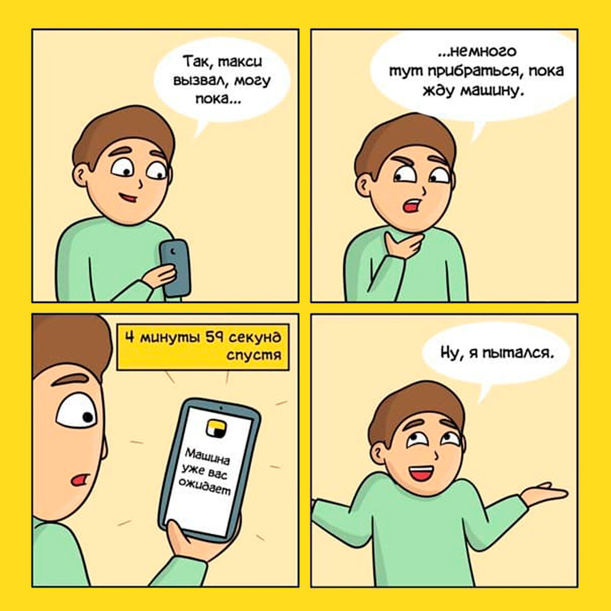 Новая серия мемов, где человек заказавший такси размышляет чем бы ему заняться пока машина в пути. Наверняка чём-то полезным, что давно нужно было, но никак не хватало времени. Эти мысли захватывают и даже вдохновляют. И тут БАЦ: «ваше такси ожидает». В общем, новая серия мемов вскрыла новую проблему в обществе, которую никто не ожидал — «такси в России приезжает слишком быстро». 🏃 Откуда пошли → Первый мем появился в ВК паблике «Добрые Мемы» 9 октября 2021. Вряд ли сам автор ожидал, что из этого получится целая серия. Но, мем что называется угадал «народную боль». 🤪 В чём прикол, значение → Мем-комикс состоит из четырёх панелей. На двух первых нам объясняют контекст — человек заказал такси через приложение и думает, что полезное он мог бы сделать пока его ждёт. Из четвёртой картинки зритель поймёт, что такси приехало слишком быстро и планам не суждено сбыться. Таким образом фантазия всех мемоделов должна уместиться в промежуточную третью картинку. Здесь серия разделилась по смыслу: