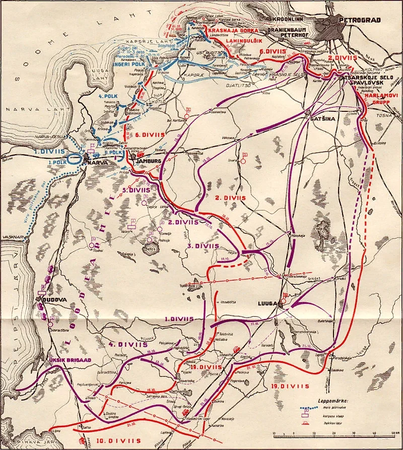 28 сентября 1919 г. Северо-Западная армия, которой с 2 октября командовал Юденич, начала новое наступление. Армия насчитывала 18,5 тыс. штыков и сабель. Вдоль южного побережья Финского залива двигалась эстонская армия Й. Лайдонера – 18 тыс. при поддержке английской эскадры. Единства между этими войсками не было. Эстонию так и не удалось склонить активным действиям. В операции участвовала не вся армия, а только десант ингерманландских частей, которые были высажены побережье Копорского залива для захвата фортов «Краснофлотский» и «Передовой» (переименованные Красная Горка и Серая Лошадь), но эти атаки были отражены. Надежды на английский флот не оправдались – он должен был уйти к Риге для подавления выступления Бермондт-Авалова. Единственной ударной силой оставалась Северо-Западная армия. Согласно плану Н. Н. Юденича сначала был нанесен отвлекающий удар на Лужском направлении. Здесь оборону 7-й красной армии удалось прорвать. Этот удар должен был отвлечь красных от основного ямбургского направления.