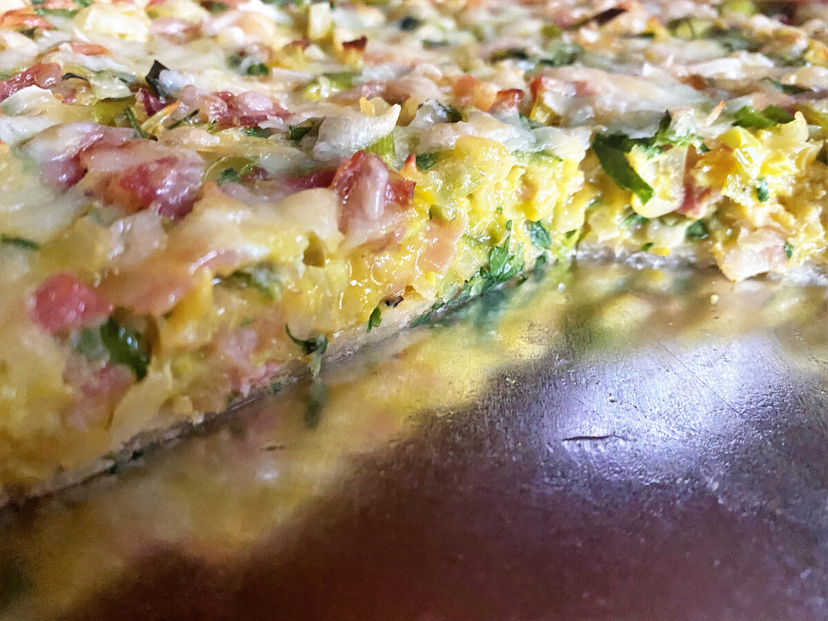 Родился киш слуком-пореем, который взрастил мой любимый огородник, и копчёным беконом.