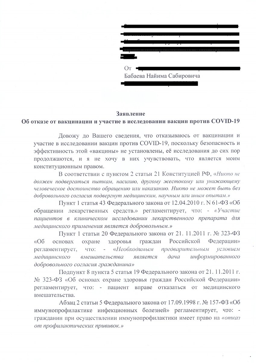 Довожу до Вашего сведения, что отказываюсь от вакцинации и участие в исследовании вакцин против COVID-19, поскольку безопасность и эффективность этой «вакцины» не установлены, её исследования до сих пор продолжаются, и я не хочу в них учувствовать, что является моим конституционным правом.