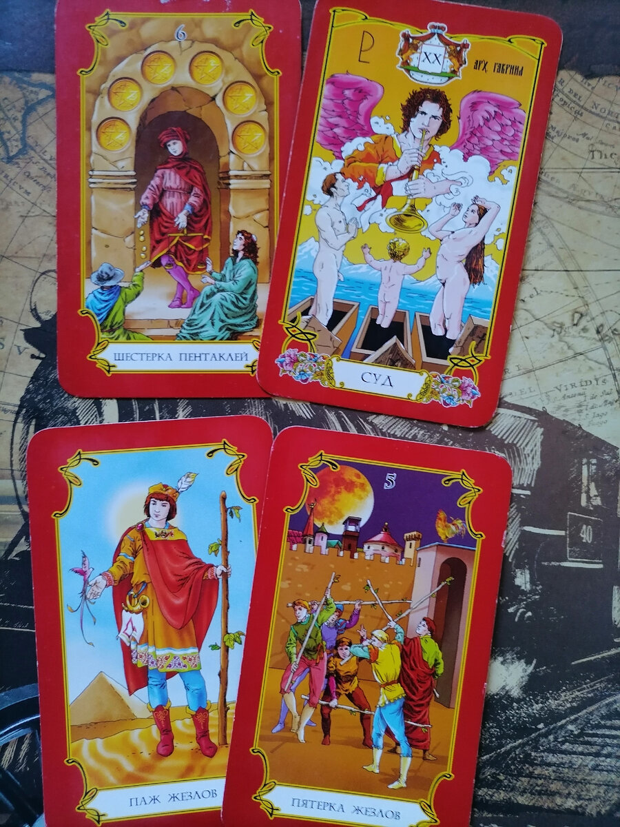 1.Карьра-деньги выпала карта 6 Денариев: Будущее развитие, очевидность получения хорошего результата. Это может относиться как к успехам в профессиональной сфере, продвижение по карьерной лестнице, или повышение оплаты вашего труда, получение престижного проекта, улучшение условий труда, получение финансовой прибыли, так и к эмоциональной сфере. Карта показывает ваше участие в работе команды или деловом партнерстве в очень прибыльном финансовом предприятии, сделке. 2. Любовь выпала карта Суд: Данная карта означает обретение отношений. Если Вы уже в отношении, то они выйдут на новый уровень. 3. Здоровье выпала карта Паж жезлов: Карта говорит об отменно, хорошем здоровье. 4. Как в общем пройдёт 2022 год выпала карта 5 жезлов: Пятерка Жезлов — это брошенный нам вызов, приглашение померятся силами, посоревноваться, проверка: хватит ли у нас силенок? Это отнюдь не связано с враждой или битвой не на жизнь, а на смерть. Нам предлагают попробовать свои силы — может быть, и вправду в ка