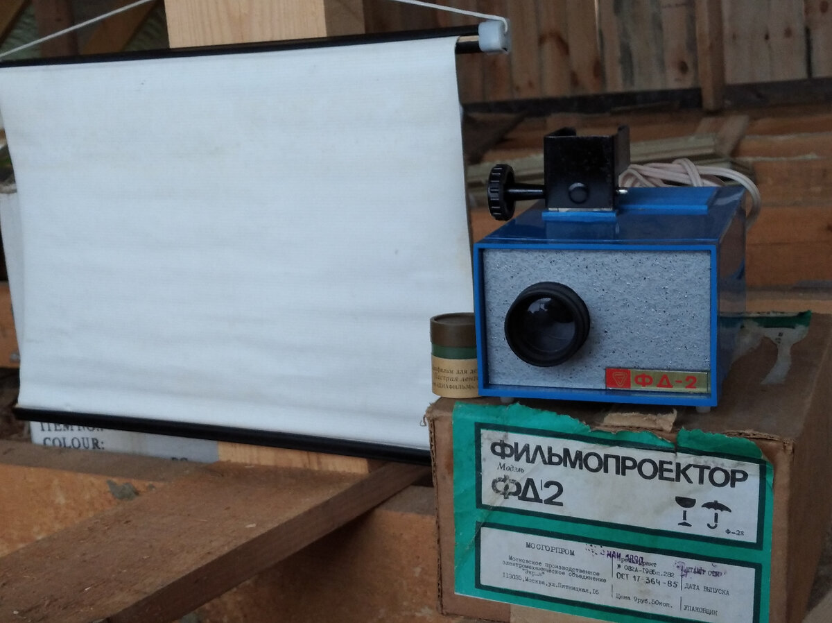 Недавно на чердаке откопал вот такое вот чудо советской техники Фильмопроектор ФД-2. И сразу нахлынули воспоминания о детстве. Как я в шестилетнем возрасте со своим братом смотрели диафильмы на этом проекторе. Это незабываемые воспоминания. Так что же он из себя представляет? Конструкция проектора довольно простая. В нём используется яркая лампа и неплохой объектив типа перископ, которые обеспечивают довольно хорошие яркость и качество изображения по всей площади кадра. Объектив алюминиевый со стеклянными линзами. Так же в набор входят: съемная рамка с резиновыми роликами для заправки пленки, виниловый экран (40см на 30см), запасная лампа. Диафильмы нужно было покупать отдельно. Вообще-то - это специальная негативная пленка, которая после проявки дает позитивное изображение. На ней размещалось примерно около сорока кадров с описанием того, что на ней происходит. Это могли быть: сказки, мультфильмы, фильмы, учебные пособия и т. д. Например у меня есть "Ну, погоди", истории про Шерлок