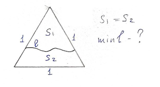 Приветствую Вас, уважаемые Читатели! Наконец на моём канале пришло время геометрической красоты. Хочу разобрать с Вами задачу, с которой с первого взгляда достаточно трудно подобраться. Тем нее менее, еще решение ограничивается методами 8-9-го класса. Поехали! Пусть линия l делит правильный треугольник со стороной 1 на две равные части. Найти минимальную длину этой линии (прямой или кривой - это уже другой вопрос). Ключевой подход к решению - это достроить треугольник до шестиугольника: Из теории изопериметрических задач известно, что фигура, которая имеет минимальный периметр при фиксированной площади - это окружность. Получается, что наша линия - это одна шестая дуги окружности. Найти её - дело техники: