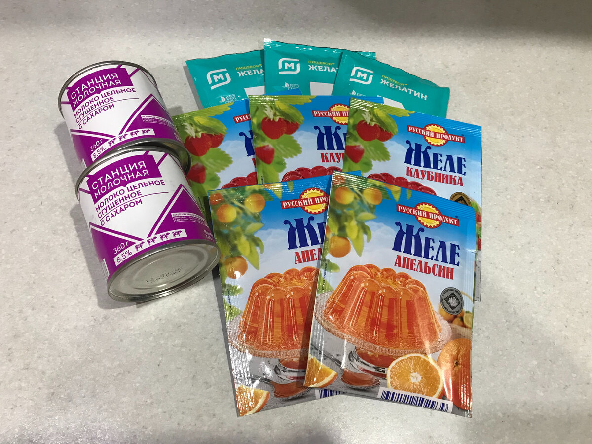Кажется что процесс приготовления очень трудоемкий, но на самом деле это не так. Все легко и просто, главное чтобы было желание))) Меня как раз потянуло на творчество, Вот и посмотрите, что я сотворила))) Что я подготовила для желе: 1. Все желе я развела по отдельным мискам согласно инструкции на упаковке. 2. Для разведения обычного желатина также воспользовалась инструкцией. 3. Обычный желатин тщательно смешала вместе со сгущенным молоком. Разделила на 4 части. 4. Выбрала квадратную стеклянную форму, но можно использовать любую, какая вам нравится. Застелила форму пищевой пленкой так, чтобы потом было удобно вытаскивать готовое желе. 5. У меня первый слой это клубничное желе. Залила его и поставила форму в морозильную камеру на 15 минут, так желе быстрее застынет. 6. Затем залила сливочную массу и также в морозилку на 15 минут. 7. Третий слой - апельсиновое желе. 15 минут в морозилке. 8. И далее продолжаем сливочное - клубничное - сливочное - апельсиновое - сливочное. И завер