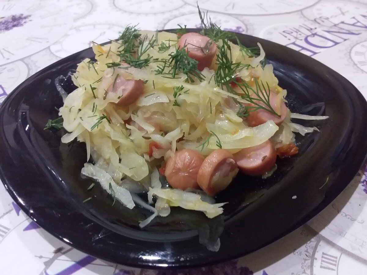 С утра я готовила щи (о них я напишу чуть позже). Осталось пол вилка капусты. Что делать? В прошлый раз оставила и забыла… В итоге капуста испортилась. Пришлось выбросить. Поэтому приняла решение потушить её. Изначально хотела приготовить это блюдо с луком, чесноком и тмином. Естественно сделала заготовку. На фотографии видно, как всё было порезано. Поставила на огонь сковородку. Налила растительного масла. Причём, достаточно много, грамм 20. Когда масло раскалилось, засыпала лук. Он обжаривался 2-3 минуты. Затем сковороду загрузила капустой. Налила пол стакана воды из только что вскипевшего чайника. Перемешала, накрыла крышкой, дала потушиться минут 20. В течении этого времени несколько раз заглядывала в холодильник. Там я обнаружила помидоры и сосиски. Мелькнула мысль: а почему бы их не добавить к готовящемуся блюду? Сначала нарезала помидоры и добавила их к капусте. Минут через десять досыпала специи: тмин, смесь сушёных овощей и зелени (обычно я добавляю эту смесь в супы), чеснок.