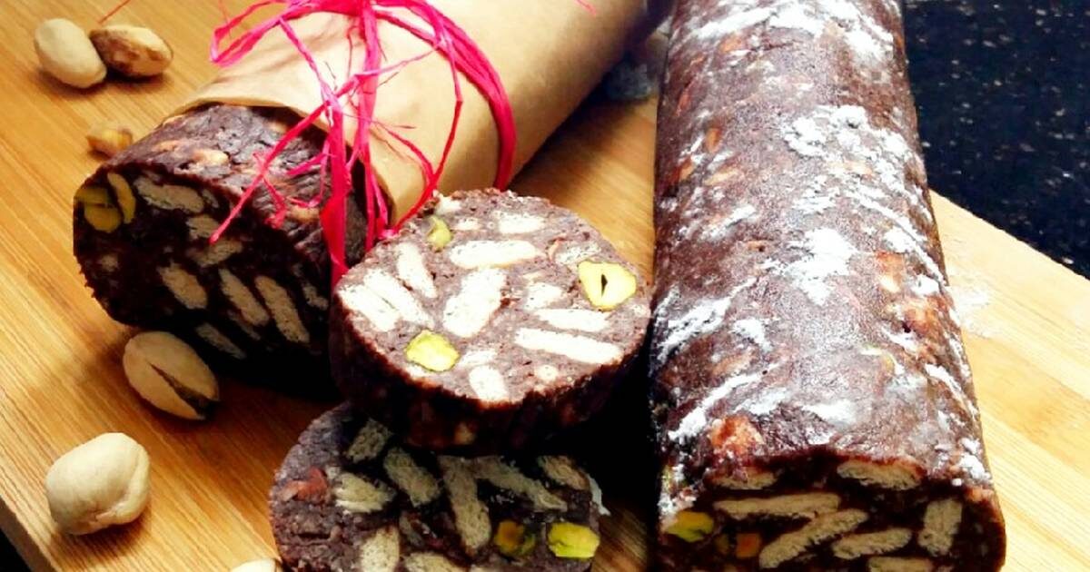Шоколадная колбаска Что нам понадобится 1. Песочное печенье - 400 гр 2. Масло сливочное - 200 гр 3. Сахар - 150 гр 4. Какао - 2 ст.л. 5. Яйцо куриное - 1 шт 6. Соль - 1 щепотка Стоимость ингредиентов - 106 рублей Как готовить 1. Для начала - сливочное масло растопить в сотейнике. 2. Добавить в масло сахар. 3. К масляно-сахарной смеси подмешать какао и нагревать, помешивая, пока не растворится сахар. 4. В горячую шоколадную смесь добавить яйцо, быстро и энергично перемешать венчиком, чтобы яйцо не свернулось. 5. Печенье растолочь разломать) на небольшие кусочки. 6. Соединить печенье и шоколадную массу. 7. На рабочей поверхности расстелить пищевую пленку, сверху выложить О