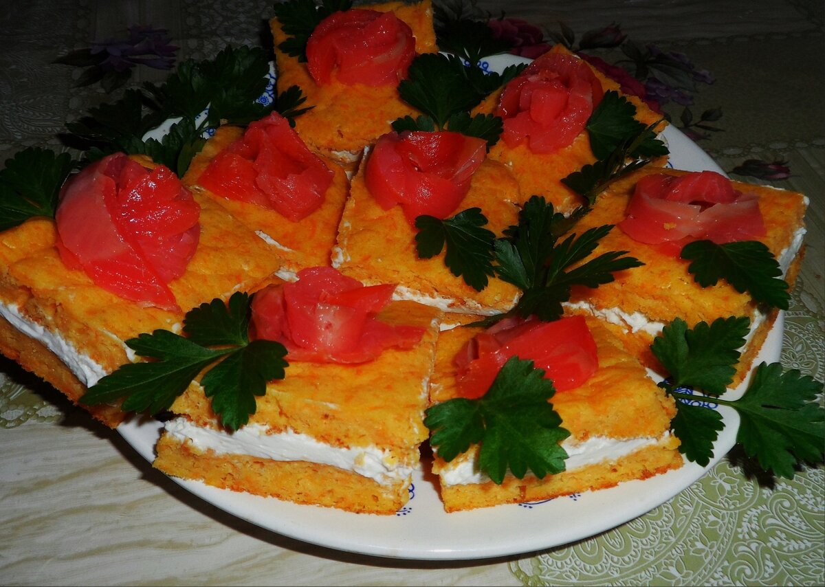 Для теста : Очищенную морковку трём на мелкой тёрке , разогреваем сковороду с 1 ст.л. растительного масла и обжариваем морковь до мягкости на огне чуть меньше среднего. Готовую морковь выкладываем в ёмкость для замешивания теста и оставляем остывать. Отделяем белки от желтков . Белки убираем в холодильник . К морковной массе добавляем желтки , сметану , растительное масло. Всё перемешиваем до однородности . Затем добавляем просеянную муку с разрыхлителем и замешиваем однородное тесто. Белки взбиваем до устойчивых пиков и аккуратно вмешиваем в тесто. Низ квадратной формы ,размером 28/ 28 , застелить бумагой для выпечки ( я форму сделала из фольги и перенесла её на противень). Выливаем тесто и распределяем равномерно по всей поверхности . Духовку разогреть до 180 градусов , запекаем 15 минут . На готовый бисквит выкладываем бумагу для выпечки и переворачиваем на противень. Аккуратно снимаем бумагу и разрезаем бисквит на 2 части вдоль. На одну часть выкладываем творожный сыр, свер