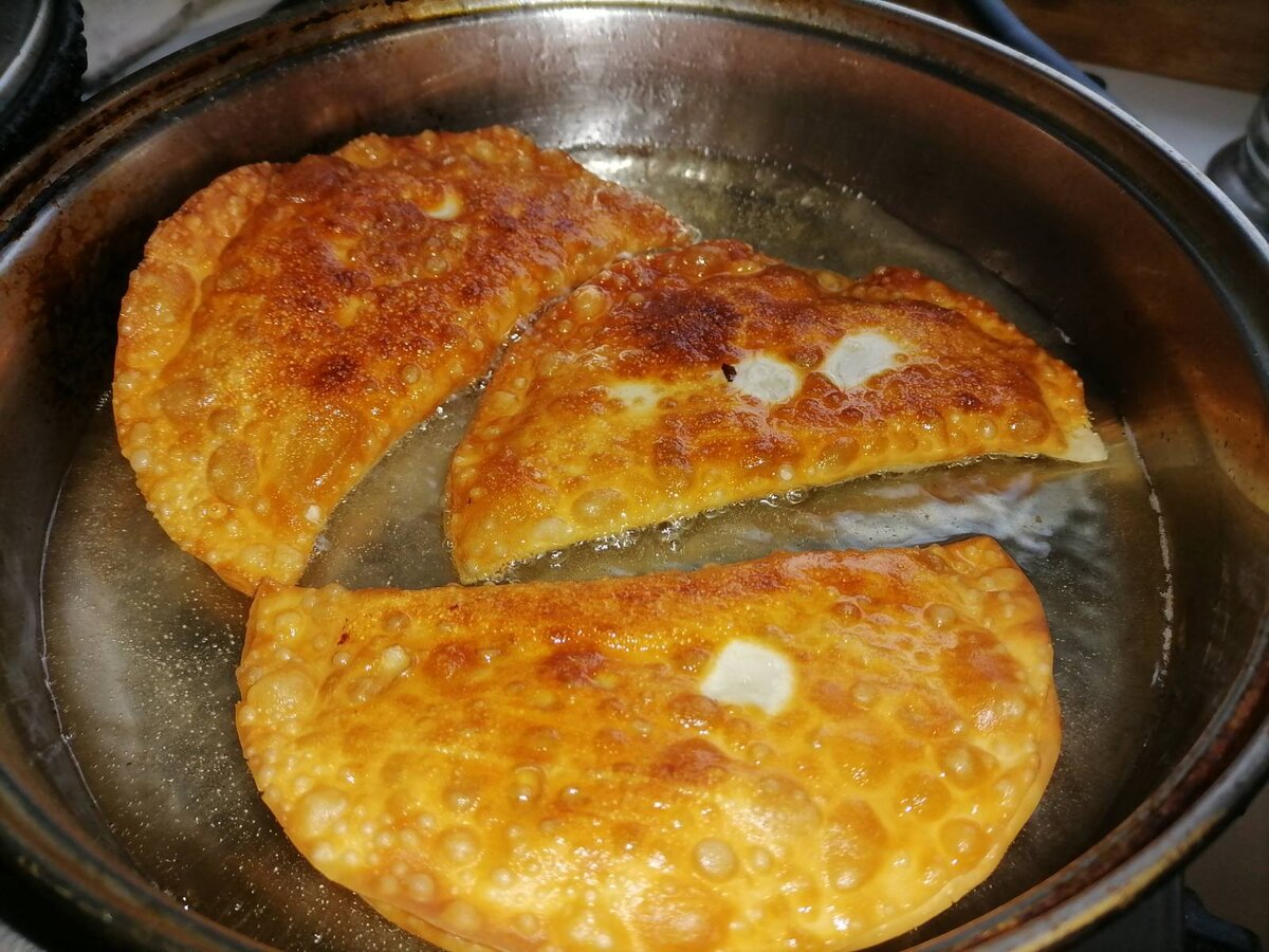 Осталось налепить чебуреки и обжарить их по три минуты с каждой из сторон в большом количестве растительного масла.