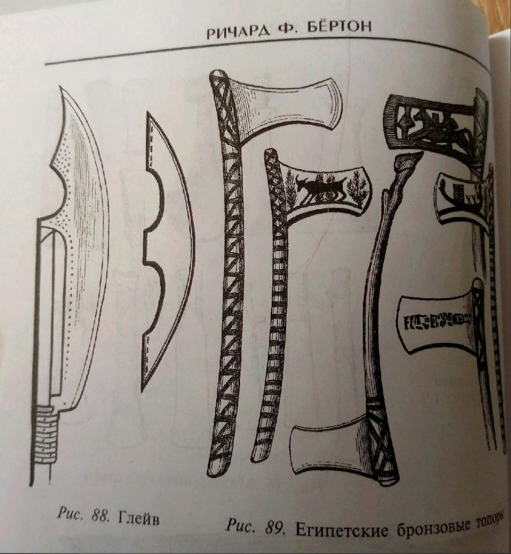 Есть расхожее мнение, что люди XIX века разбирались в средневековом холодном оружии лучше нас, современных, поскольку оно к ним было хронологически ближе, чем к нам. И вообще в истории они по той же причине лучше разбирались. Это мнение часто используется как аргумент в ситуациях вроде "русские путешественники в Японии назвали катаны саблями - а им-то виднее было!" Что ж. Тогда, значит, русский бердыш - это римский гладиус и средневековый странный девайс. Одно и то же. Не верите? Щас будут пруфы...)) Есть такая книга - "Книга мечей" Ричарда Ф. Бертона. Написана в конце XIX века, иллюстрации нарисованы тогда же. Представляет из себя попытку проследить хронологию развития меча как такового, кое в чем прелюбопытную... "Это сложносоставное оружие, в котором дубинка объединялась с кельтом, или ручной топор, появившийся в Европе в начале неолита, сыграло замечательную роль в истории - древней, средневековой и даже современной; а связь его с мечом становится очевидной, если посмотреть на коро