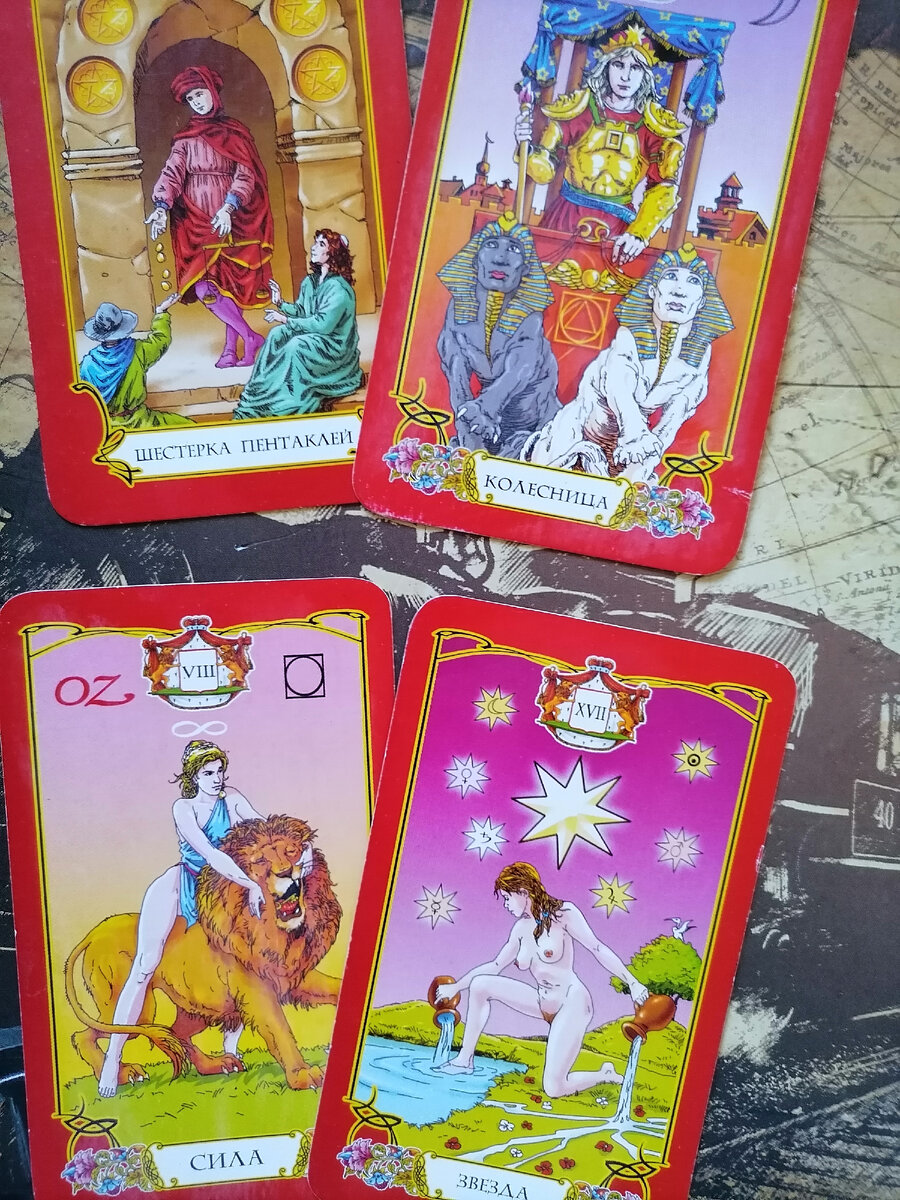 1.Карьера-деньги выпала карта 6 денариев: В раскладах на карьеру Шестерка Монет – это перспективность, видимые результаты, хорошая координация действий (в частности, с Тузом Мечей). Причем традиционно для этой карты говорить здесь можно и о материальном, и об эмоциональном аспекте. Скажем, перспективность может выразиться в движении по должностной лестнице (т.е. в престижности), а может – в увеличении заработков. В плане событий Шестерка Монет предсказывает успехи в поисках работы (или в претензиях на новую должность. 2.Любовь выпала карта Колесница: Для раскладов на отношения Колесница – это ощутимая динамика в отношениях; новое, очень важное знакомство; оживление отношений, ставших рутинными. Колесница, трактуется как акценты, расставленные в отношениях, и прекращение в них неразберихи и недомолвок. А еще это вполне определенное указание на то, что решительные действия есть необходимое условие, чтобы были, наконец, достигнуты гармония и счастье в отношениях. 3.Здоровье выпала карта