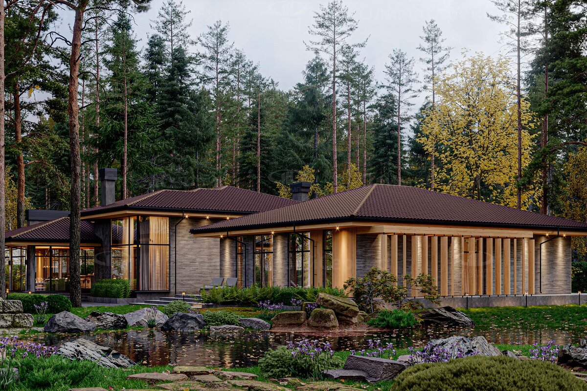 - У крыши широкие свесы, ассоциирующиеся с японской пагодой (заимствованы из восточной архитектуры).