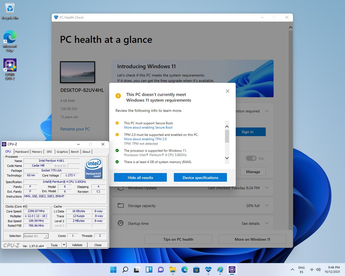 По недосмотру компании Microsoft новая операционная система Windows 11 может работать даже на системах на базе древних процессоров Intel Pentium 4. Во всяком случае, такого мнения придерживается утилита PC Health Check для проверки совместимости компьютера с новой ОС. Более того, энтузиаст смог успешно запустить Windows 11 на системе с Pentium 4, так что это не просто ошибка утилиты. В начале 2022 г. процессору Pentium 4 661 исполнится 15 лет. Он был выпущен в I квартале 2006 г. и производился по 65-нанометровому техпроцессу. К моменту релиза Windows 11 в начале октября 2021 г. Pentium 4 661 успел безнадежно морально устареть. Учитывая, что официальные требования Windows 11 требуют минимум Intel Core 7 поколения, удивительно наблюдать, как фирменная утилита совместимости не находит никаких проблем в CPU, выпущенном почти десятилетие назад. К тому же Windows 11 на таком CPU не только работает — работает и её система обновлений. Хотя ранее Microsoft сама заявляла о том, что несовместимые