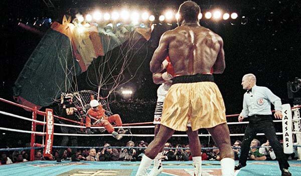 Парашютист приземлился прямо на ринг во время боя Холифилда с Боу (Видео)