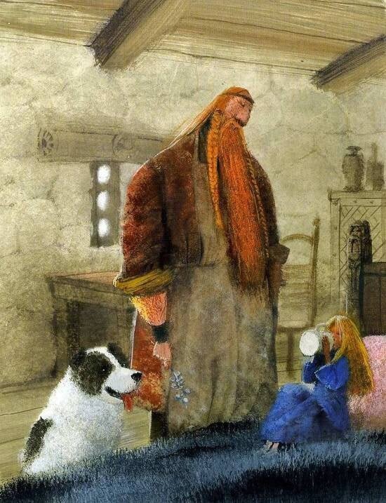 У викинга есть маленькая Грид, ужасно дочка любит молоко. Оно течёт по платью, по щекам (пей, милая, и станешь здоровей). Грид гладит толстопузого щенка, у смерти отвоёванного ей: мой папа не уедет никогда,