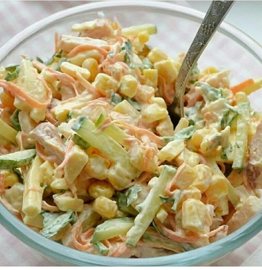 В этой статье мы поговорим о трех салатах, которые можно сделать быстро, ингредиенты в них не дорогие, а салатики получаются очень вкусные! Первый салат подойдет тем кто соблюдает правильное питание, а также для тех кто любит мясо в салатах :) Ингредиенты (на 4 порции): Для того чтобы его приготовить нам нужно всего лишь нарезать все ингредиенты соломкой, натереть морковь на тёрке, открыть банку кукурузы, всё перемешать, заправив майонезом, готово! По затратам не много, затраты энергии на его приготовление еще меньше, идеальный салат! Второй салат "Витаминный с крабовыми палочками", подойдет для тех кто любит крабовые палочки и здоровую пищу :) Ингредиенты на 6 порций: Для приготовления нарезаем свежую капусту тонкой соломкой, мелко нарезаем зелень, огурцы нарезаем полукольцами, открываем банку с кукурузой и сливаем оттуда жидкость, режем крабовые палочки, если вы выбираете лук репчатый, то режем его тонко полукольцами, затем мы всё смешиваем и добавляем соль, заправляем майонезом и г