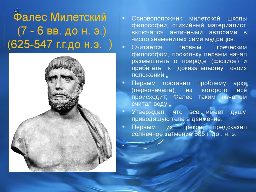 Фалес – древнегреческий философ из Милета в Малой Азии, жил на рубеже 6-5 вв. до н.э. Фалес памятен человечеству тем, что выделил вещество как причину окружающих вещей.