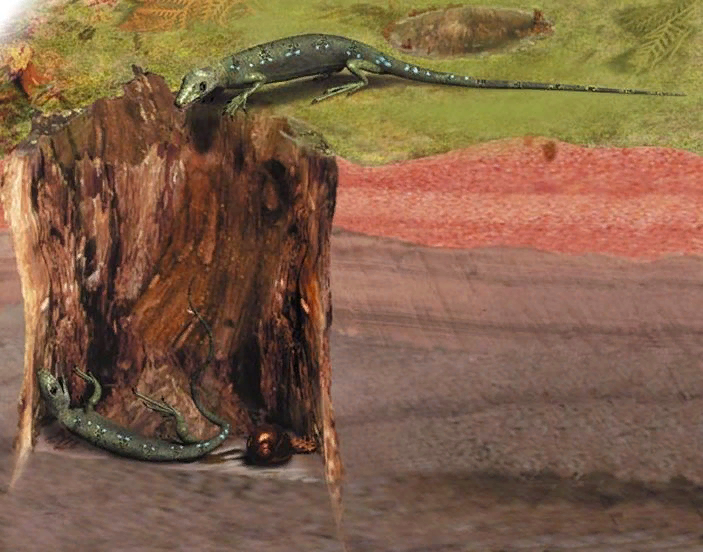 Жили-были на Земле в каменноугольном периоде такие существа - гилономы. Это были маленькие рептилии длиной до 25 см, похожие на зелёных ящериц или сцинков. Они вели активный образ жизни и питались, скорее всего, мелкими членистоногими. Гилонома можно считать одной из самых древних рептилий. Эти товарищи жили в среднекаменноугольных болотистых лесах на территории нынешней Новой Шотландии. Там росли древовидные плауны сигиллярии, гигантские лепидодендроны и высокие, похожие на деревья хвощи - каламиты. Вместе с гилономами лесное местообитание разделяли предки млекопитающих - азафестеры и протоклепсидропсы, рептилии петролакозавры, первые темноспондильные и лепоспондильные амфибии. Первые останки гилонома были обнаружены еще в 1859 году канадским геологом Джоном Уильямом Доусоном в скалах Джоггинс на берегу залива Фанди в Новой Шотландии (Канада). В 2008 году их внесли в список Всемирного наследия ЮНЕСКО. Сегодня место находки известно как местонахождение Coal Mine Point; там представлены