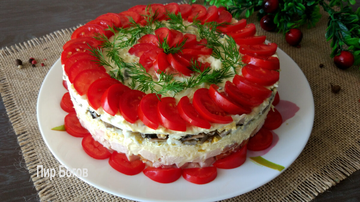Сегодня у нас очень яркий и красивый салат. Он выкладывается слоями и внешне очень похож на торт. Такой салат украсит любой праздничный стол. Ингредиенты очень хорошо сочетаются и дополняют друг друга. Салат с грибами и копченой куриной грудкой получается вкусным и сытным. Салат выкладываю в кольцо Ф 18см *** Подробный рецепт можно увидеть в видео на моем канале здесь или на канале YouTube Пир Богов вот здесь 🥗. Еще там есть много вкусных рецептов. 🥗🥧Подписывайтесь))) 😉 *** Состав: 450гр копченой курицы 250-300гр шампиньонов 3 яйца 100гр твердого сыра 1 луковица Майонез Помидоры Зелень Соль, перец Способ приготовления: Чистые грибы нарезаем средними кусочками. Лук нарезаем маленькими кубиками. На горячей сковороде с маслом обжариваем лук 2 минуты. К луку выкладываем грибы и все жарим до изменения цвета грибов и испарения жидкости. Готовые грибы солим и перчим. Куриное филе нарезаем кубиком. Сыр натираем на мелкой терке. Вареные яйца натираем на крупной терке. Делим на две части. П