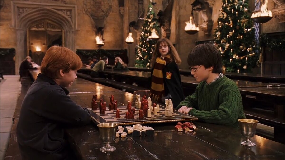 В одной из самой популярной серии фильмов "Гарри Поттер", очень любят поиграть в шахматы. Уже в первой части юные волшебники предпочитают коротать время за шахматной доской. Рождество Игра в шахматы у героев фильма в большинстве случаев происходит в рождественский период. Некий обычай. Например, впервые в шахматы Гарри сыграл благодаря Рону, который обучал его игре в преддверии рождества. Правила у волшебных шахмат точно такие же, как у обычных, только фигурки двигаются сами. Игра спасла жизнь Знания правил игры спасли жизнь в первый год обучения. Благодаря умению играть в шахматы и сообразительности Рона,ребята смогли выйти живыми из партии, в которой не должны были участвовать. Чтобы спасти профессора Снегга, Рон пожертвовал собой. Это ли не черта настоящего чемпиона! Победа факультета Благодаря блистательной партии в шахматы и самопожертвованию Рона, весь факультет одержал победу за семестр! Вот тот самый момент: — А сейчас, как я понимаю, все ждут вручения школьного кубка. Баллы р