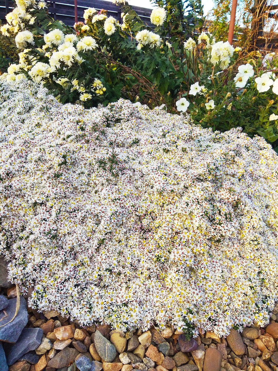 Не ошибусь,если присоединюсь ко мнению многих цветоводов и ландшафтных дизайнеров по вопросу однозначной посадки на участке,в своём цветнике многолетних растений. Предпочтение необходимо отдать тем сортам и видам, которые декоративно смотрятся весь сезон- от ранней весны до самых заморозков. К таким многолетникам, украшающих цветник постоянно, относится Астра вересковая "Снежное облако". Мы её высадили в рокарии, так как решили там создать композицию из хвойников. Вы сталкивались с такой проблемой, что хочется всё и сразу, а не получается из-за недостатка финансовых вливаний? Хвойники зрелого возраста, во всей красоте- удовольствие не из дешёвых. Растут они медленно. Купив маленькое растение по приемлемой цене, мы обрекаем себя на три-четыре года унылого вида усадьбы по причине длительного роста хвойных культур. Чтобы скрасить ожидание, можно и нужно подсаживать к ним многолетние растения неприхотливого характера, быстро растущих и осваивающих пустое пространство. При