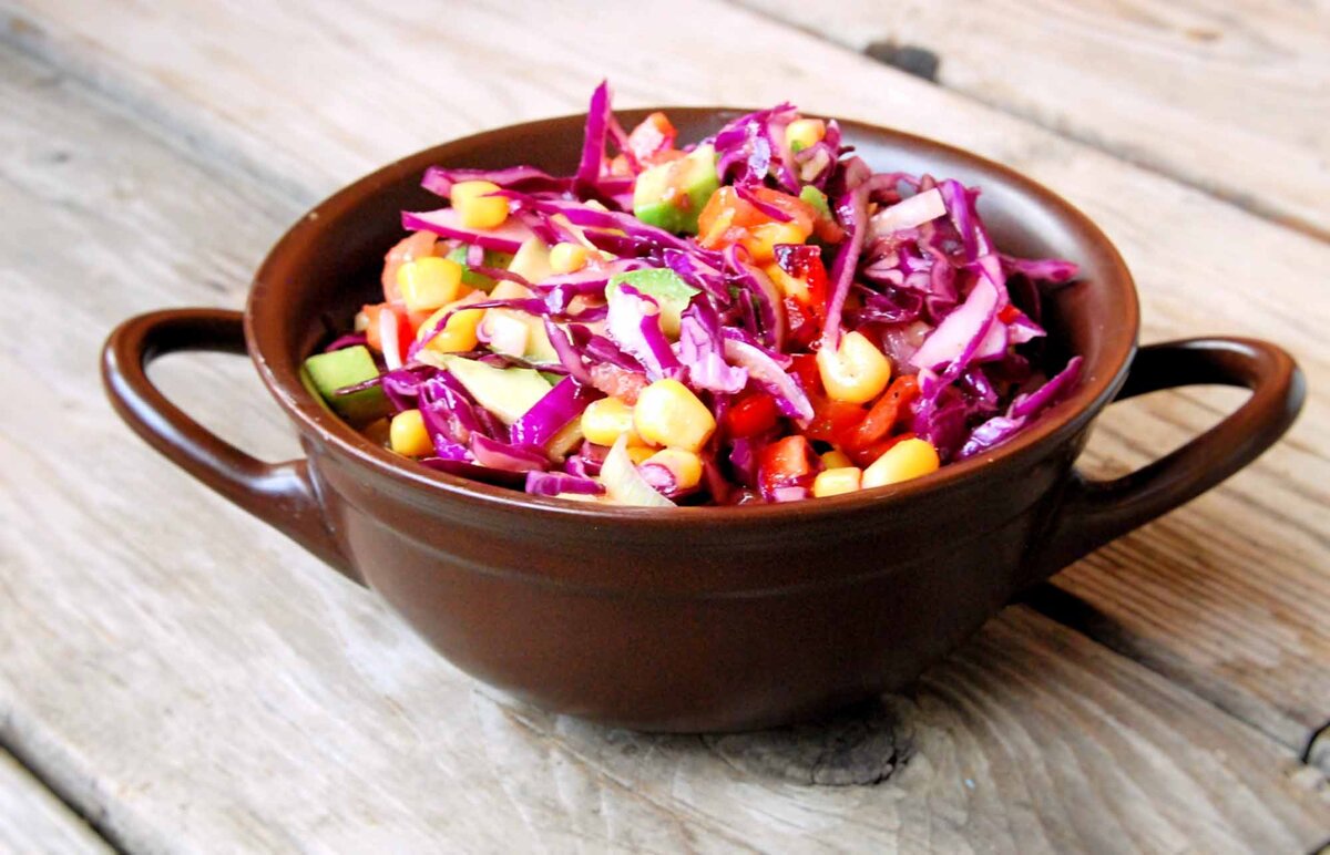 Нет, ни в коем случае этот салат не заменит «Оливье» на вашем праздничном столе! Это было бы настоящим кощунством. :) Пусть он просто постоит рядом на столе и, уверяю, будет также пользоваться спросом. Блюдо очень симпатичное внешне и гармоничное по подбору ингредиентов. Зимой, когда просто свежие овощи уже не такие вкусные, может стать им небанальной альтернативой. Готовится очень быстро — все, так сказать, из-под ножа, ничего предварительно мариновать или отваривать не нужно. Ингредиенты для «Нарядного» салата Лучше всего сюда подойдет краснокочанная капуста, с обычной тоже вкусно, но не так красиво. А еще понадобится следующее: Полный список ингредиентов: примерно 400 грамм капусты; 1 банка сладкой кукурузы; 1 крупный или 2 небольших помидора; 1 болгарский перец; 1-2 спелых авокадо; 2-3 пера зеленого лука. Заправка: 1/2 крупного лимона или 1 лайм (цедра и сок); 2 чайные ложки меда (можно заменить сахаром); чайная ложка горчицы; 2-3 зубчика чеснока; 4 столовых ложки оливкового ма