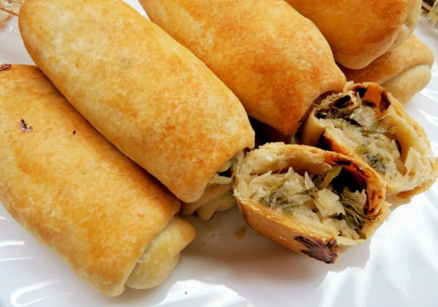 Берем кусочек нашего теста и раскатываем его как можно тоньше, чтобы он стал прозрачным. На край выкладываем начинку, загибаем внутрь боковые краешки и начинаем аккуратно заворачивать нашу трубочку. Таким же образом поступаем с оставшимися кусочками теста.