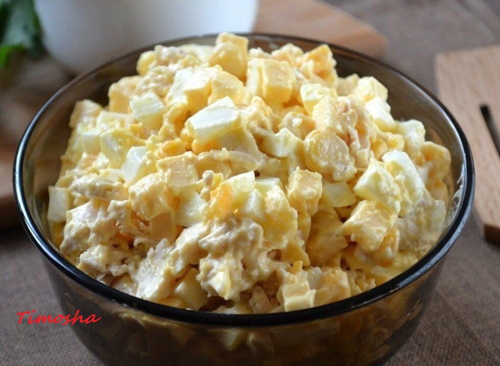 Здравствуйте, сегодня мы с Вами приготовим очень вкусный и сытный салатик. Он готовится из простых и доступных ингредиентов и прост в приготовлении. Салат отлично подойдет как дополнение к основному блюду. Также его можно использовать в одиночку, как полноценное блюдо, ведь он очень сытный. Я готовлю его как дополнение к основному ужину. У меня в семье так принято, обязательно на столе должен быть салат, не важно, какой, хоть просто из помидоров и огурцов. Возвращаемся к нашему сытному салату. Для приготовления салатика нам потребуется: Приступаем к приготовлению: Приятного аппетита!!! Готовьте с Тимошей!