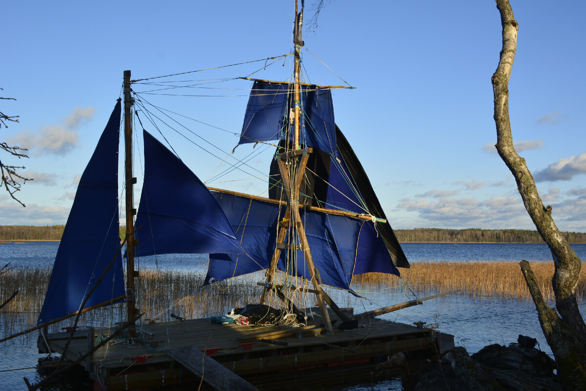 Вот, какой плот получился в итоге: А теперь о том, как мы его построили: Предыстория. В конце 2018 года мне было скучно. Жизнь стала немного серой, в том смысле, что в ней стало меньше приключений и кислорода. И тут вспомнил, что после окончания школы в 2013 году, сразу после экзаменов, мы с друзьями построили бревенчатый плот с одним нелепым парусом и механизмом с лопастями: И я подумал, чё то давно мы не строили плоты. Надо бы летом замутить) Становление идеи. Прошерстил весь гугл и ютуб, чтобы понять как строить каркас. Я выбрал плот на бочках. Но такой плот может сделать каждый, мне нужно было что посложнее. Мой главный интерес - парусники. И я набросал первый проект будущего парусного плота: В течение зимы 2018-2019 проект эволюционировал в это: По размерам: 6х3,5 м каркас. Высота мачт 5,5м и 4,5м 14 металлических бочек вплотную друг к другу. Предварительная подготовка. Надо было найти материалы. С этим нам сильно повезло. Мы нашли неплохие бочки по 50 руб за штуку. Да, я не оп