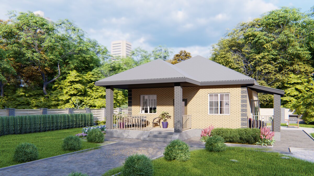 Небольшой и недорогой дом, в котором есть все – именно этого хотят те, кто не желает покупать квартиру студию в современном ЖК, но не имеют достаточно средств для постройки большого дома. А многие просто не хотят затягивать строительство, а поскорей заехать в новый, уютный дом. Мы об этом знаем, а потому стараемся создавать проекты недорогих и комфортных домов по цене квартиры. Представляем вашему вниманию проект одноэтажного дома размером всего 9 на 10 метров, в котором есть все необходимое. Здесь раздельные кухня и гостиная, две спальни с гардеробными, кладовая и полноценная ванная. Этот проект особенно порадует тех, кому не нравятся спальни со стороны переднего фасада, окна спален обращены на задний двор и в целом приватная зона максимально отделена от дневной. Идею для этого проекта мы позаимствовали у нашего читателя на яндекс дзене, который поделился ей в комментариях. Так что если у вас есть интересные идеи для планировок делитесь ими например в нашем Телеграм чате, а остальные