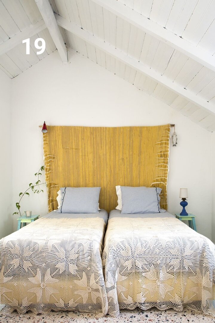Простая и просторная гостевая комната в португальском доме отдыха, принадлежащая испанской модели Eugenia Silva. Кровати покрыты хлопковыми покрывалами из Болгарии, на стене висит португальский, а кафельный пол оригинален для дома.