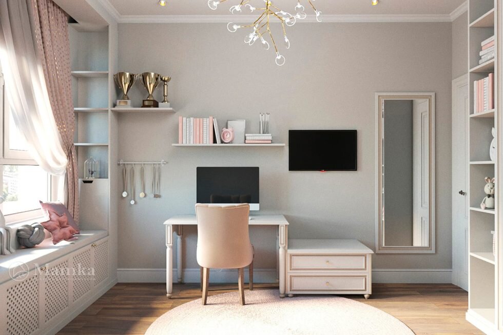 Уютная детская для девочки с классической мебелью. Мебельная фабрика Mamka позаботится о том, чтобы мебель в комнате была функциональной и красивой. Фото на сайте Этот удивительный проект наполнен светом и домашним уютом. Благодаря элегантной мебели пастельных тонов комната площадью 16 м2 кажется намного просторнее. Рабочая зона в спальне лаконичная, но удобная. На широком письменном столе найдется место и для компьютера или ноутбука, и для тетрадей с книгами. Над столешницей есть плоская полочка для книг, тетрадей и альбомов. Рядом с письменным столом разместилась низкая тумбочка на два выдвижных ящика. Интересный акцент этой комнаты – зона вокруг окна. Она представлена единой деревянной конструкцией с диваном под самым окном и вертикальными боковыми стеллажами. Полочки и закрытые секции можно использовать как систему хранение или как место для декоративных предметов. Мягкий диван имеет широкое сиденье, поэтому на нем можно удобно расположиться для игр и отдыха. Фигурная спинка, тонк