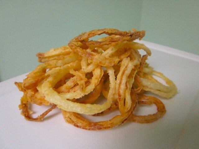 Лук салатный крупный - 2 шт. Кислое молоко - 2 1/2 стакана Яйца - 2 шт. Вода - 3 ст. л. Мука - 1 3/4 стакана Соль - 2 ч. л. Порошок чили - 2 ч. л. Кайенский перец - 1-2 ч. л. Сахар - 1 ч. л. Чесночный порошок - 1 ч. л. Кумин молотый - 1 ч. л. Масло растительное для фритюра 1. Лук почистить и порезать кольцами, толщиной примерно 0,5 см. Сложить лук в большую миску, залить кислым молоком и вымачивать около 30 минут, пару раз перемешав. 2. В неглубокой миске взбить яйца с водой. В другой мелкой миске смешать муку, соль, порошок чили, кайенский перец, сахар, чесночный порошок и кумин. 3. Кольца лука выложить на бумажное полотенце, затем погрузить во взбитое яйцо, а потом обвалять в муке. 4. Во фритюрнице или другой глубокой посуде разогреть растительное масло (примерно 2,5 см в высоту посуды) до 180 градусов. Выкладывать в разогретое масло небольшими порциями лук и жарить около 1-2 минут с каждой стороны, до золотистого цвета. Жареный лук выложить на бумажное полотенце, чтобы стек лишний ж