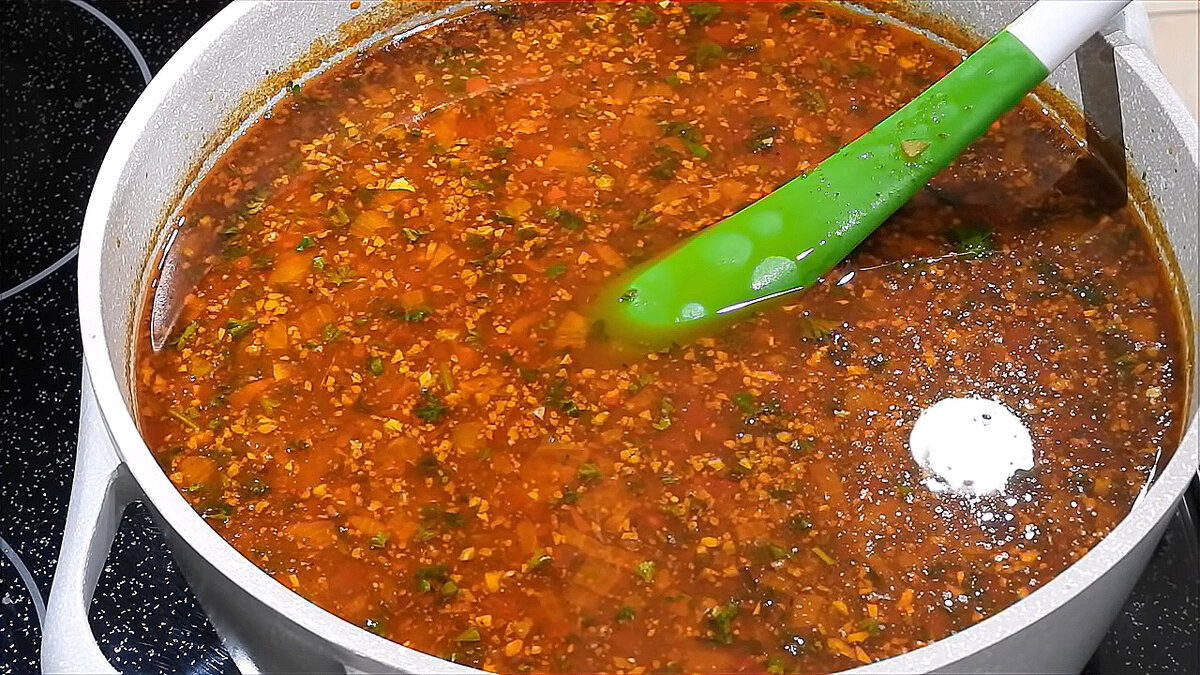 Грузинская кухня. Суп харчо Состав продуктов: на 3.5-4 литра бульона 1.4 кг говядины 1 лук репчатый 400 г свежих помидоров без кожицы или в собственном соку 1.5 ст. л. хмели - сунели 4 ст. л. соус ткемали 2-3 ст. л. аджики 1 ч. л. сахара 3 ст. л. растительного масла 5 ст. л. риса (1.5 ст. л. риса на 1 литр бульона) 2 ст. л. измельченных грецких орехов обжаренных 4 ст. л. кинзы + петрушка 2-3 зубчика чеснока измельчить ножом Соль по вкусу Чёрный молотый перец по желанию Как приготовить: Здравствуйте! Сегодня мы будем готовить суп харчо. Его я буду готовить из говядины, у меня немного мякоти и ребрышки. Сейчас нам нужно слегка обжарить мясо и ребра на сковороде, обжариваем на большом огне до румяной корочки. Если вы еще не подписаны на мой канал, подписывайтесь, чтобы не пропустить новые рецепты. Обжаренное мясо мы перекладываем в кастрюлю. Мясо заливаем водой, доводим до кипения, обязательно нужно снять пену, и варим до готовности, до тех пор, пока мясо будет отставать от кости